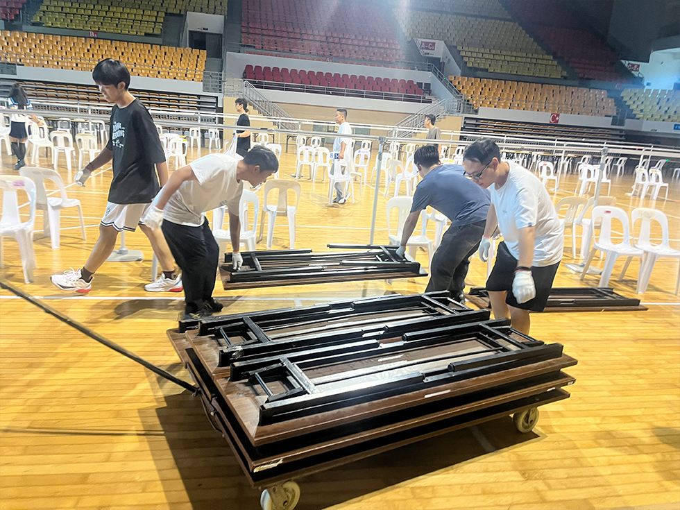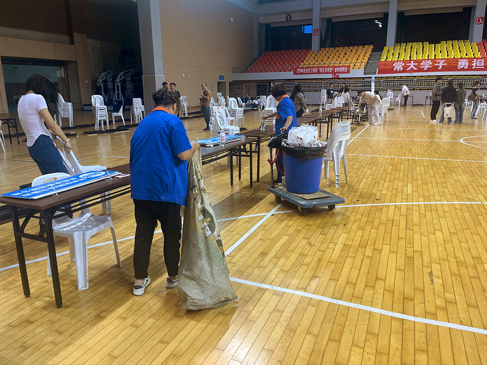 为确保招聘会顺利举行,场馆中心按照要求积极部署,事先与主办方及学生工作处进行沟通、联系,进行场地的规划、协调。工作人员提前进行场地布置,搬运桌椅、搭设及摆放布置展架,并认真落实场地所需电源的接驳与布设,同时做好场地清理保洁、所需垃圾桶摆放等,切实保障招聘会万无一失。招聘会当天,工作人员持续开展馆内巡查,有序引导,维持现场秩序,并持续关注会场卫生环境情况,配合主办方确保活动顺利进行。招聘会结束后,工作人员第一时间对场地进行了清理,重新布置,有效地保障体育教学、训练活动正常进行。