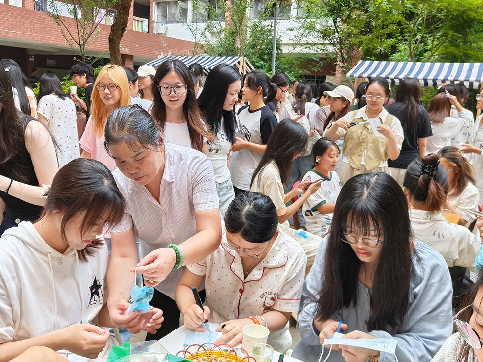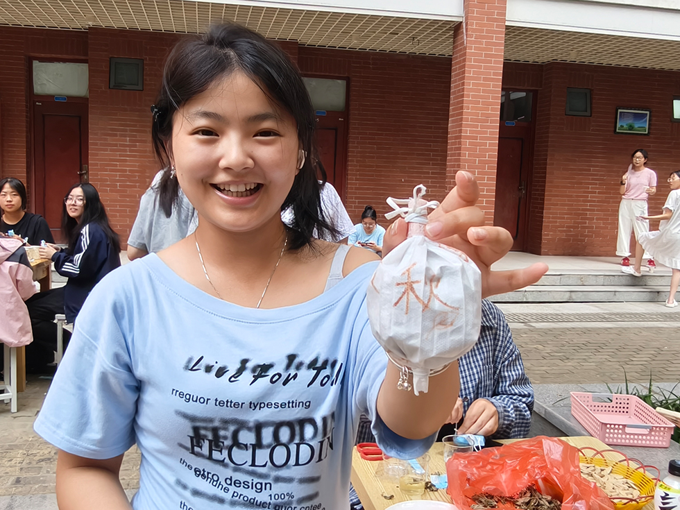 此外,管理部还就地取材,利用校园内的桂花、艾草等植物,开展了“巧手制香包”互动活动,同学们踊跃参与,在工作人员的指导下亲手制作香包。现场氛围热烈,欢声笑语不断,让同学们放松身心的同时,感受传统文化的魅力。
