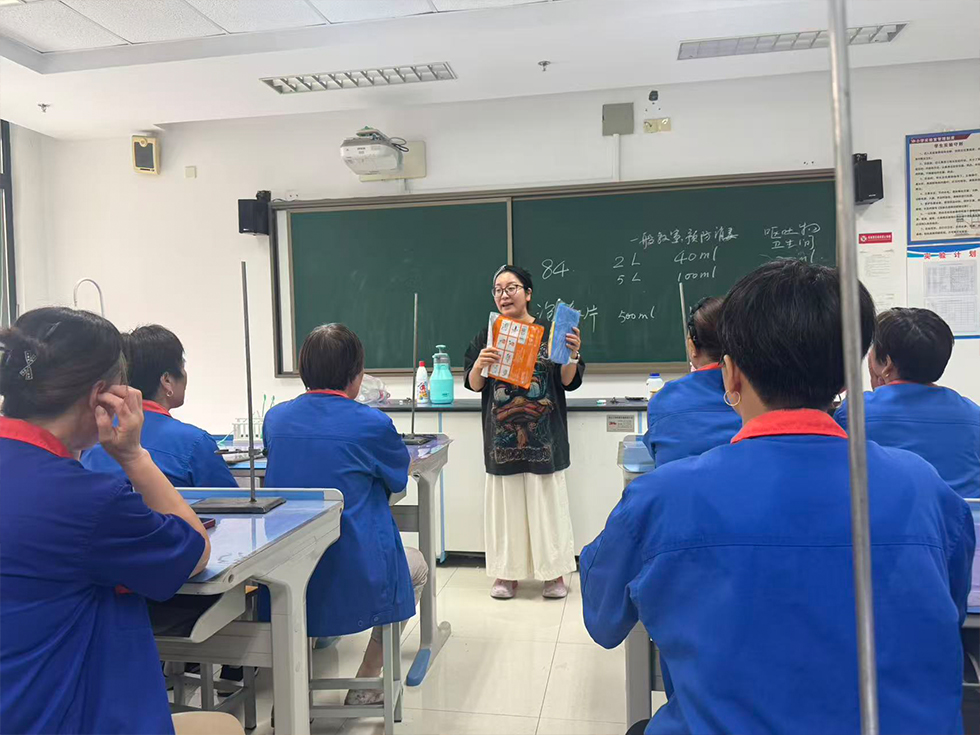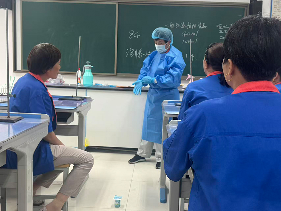 培训分为“预防方法学习”与“情景模拟操作”两部分。在校医指导下,保洁人员学习了呕吐物辨别方法、不同区域消毒液配比标准,并现场演练呕吐包使用及污染环境消毒流程,提升了应急处置能力。培训还通过互动问答,强化了员工对诺如病毒特性、传播途径及预防措施的掌握。