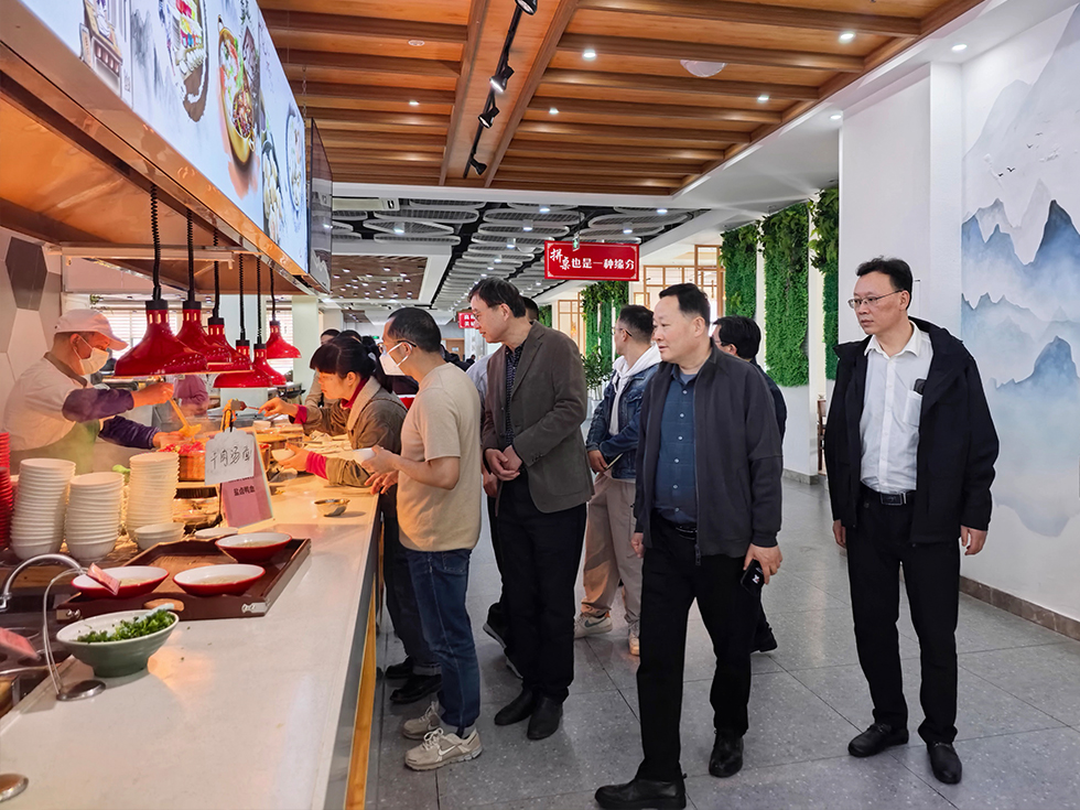 交流会上,汪国余代表公司对葛宇一行的到来表示热烈欢迎,向对方简要介绍了公司基本情况和业务布局,详细介绍了餐饮板块的运营模式、服务范围及管理优势。葛宇介绍了二院食堂在成本核算、人员管理等方面的工作。双方围绕食堂运营模式、成本管控、服务质量等内容展开深入交流,分享工作思路和实践经验,共同探讨食堂经营管理问题。会后,汪国余陪同来宾实地参观了科教城校区食堂。